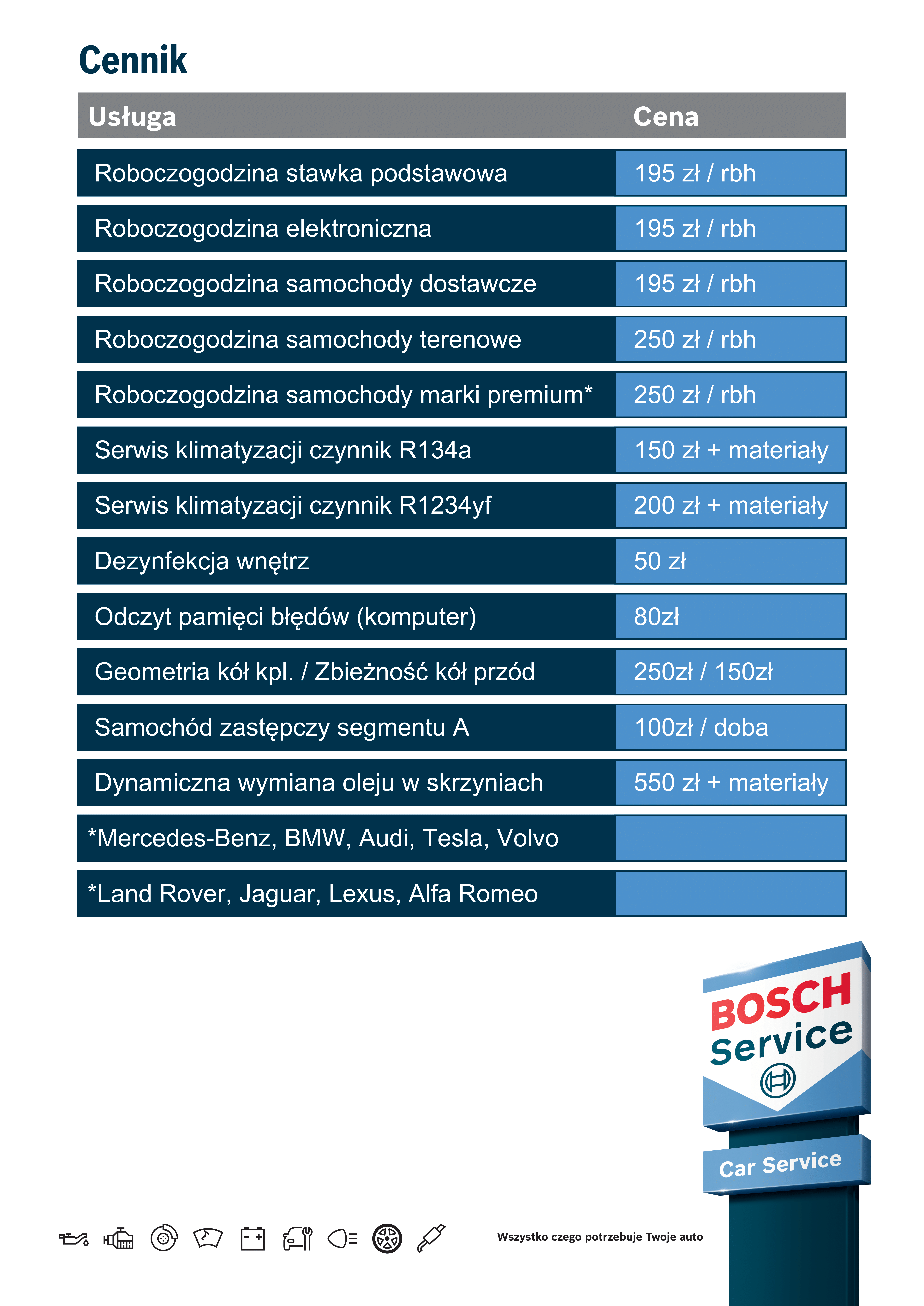 Poniżej przedstawiamy przykładowe ceny wybranych usług i oferowanych towarów. W celu uzyskania dokładnych informacji prosimy o kontakt telefoniczny.